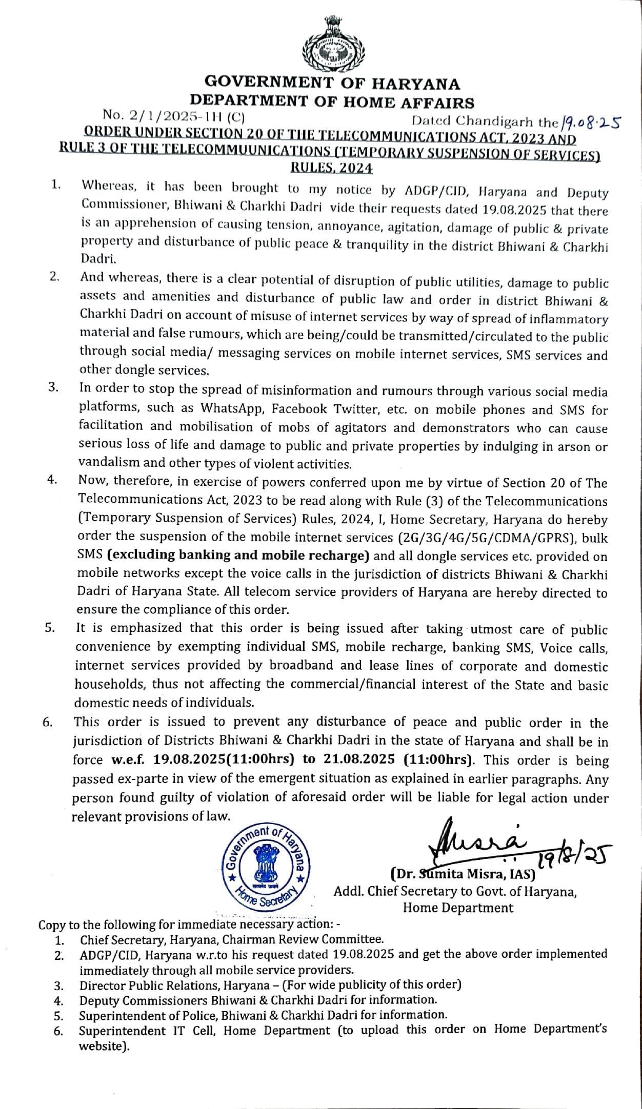 Internet Suspend: हरियाणा के दो जिलों भिवानी और चरखी दादरी में इंटरनेट बंद करने के आदेश जारी किये गए हैं। माना जा रहा है कि मनीषा केस में इंटरनेट सेवा बंद करने के आदेश जारी किये गए हैं।
