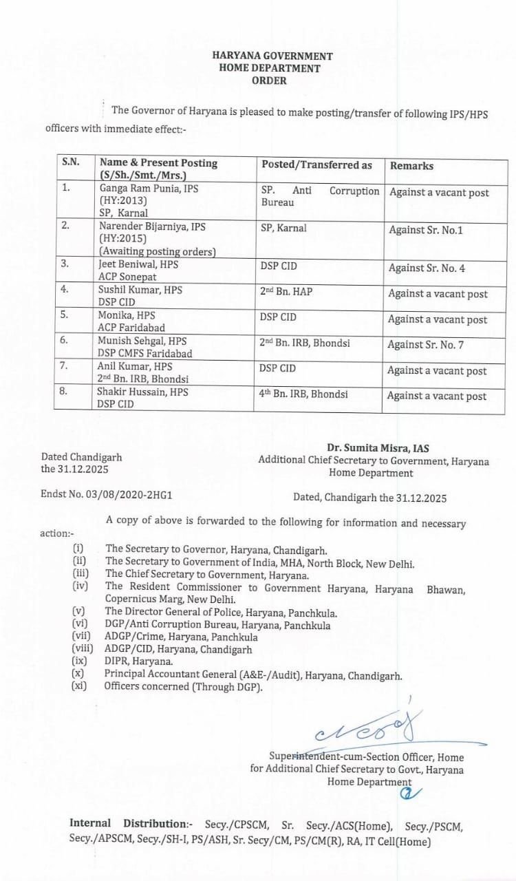 IPS HPS Transfer: हरियाणा में बड़े स्तर पर IPS-HPS अफसरों के तबादले और नियुक्ति के आदेश जारी किये गए हैं। एक तरफ जहां हरियाणा को आज नया डीजीपी मिल गया है वहीं कई दिनों से पोस्टिंग का इंतजार कर रहे नरेंद्र बिजारणियां को करनाल एसपी लगाया गया है। वहीं करनाल एसपी गंगाराम पूनिया को एसीबी में भेजा गया है।