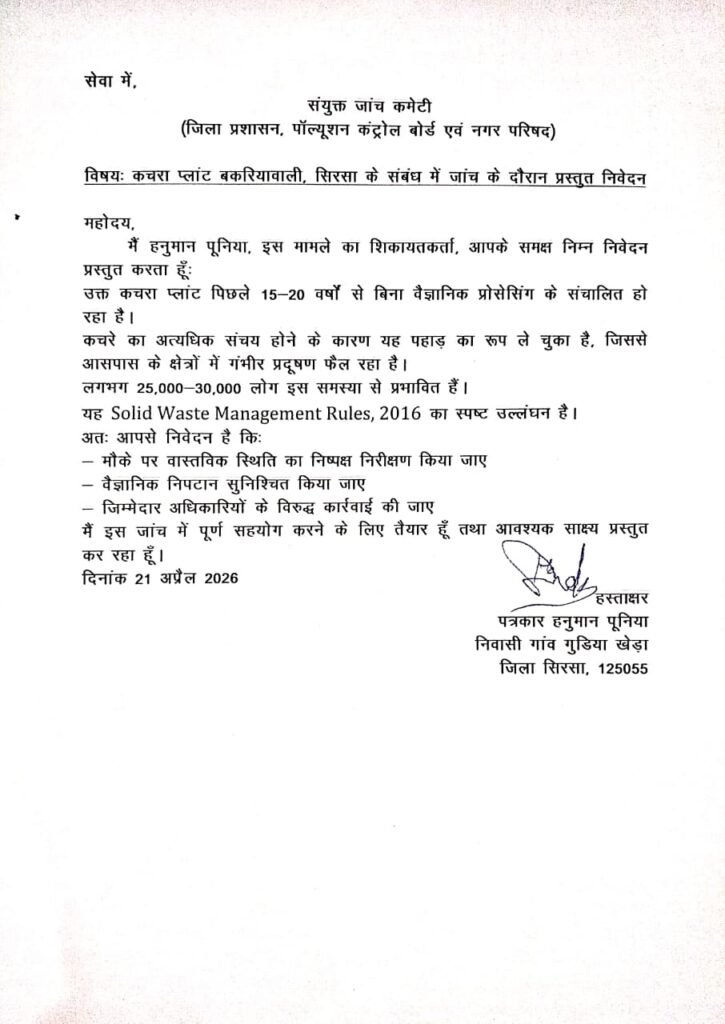 चौपटा। सिरसा जिले के गांव बकरियावाली स्थित कचरा प्लांट का निरीक्षण नेशनल ग्रीन ट्रिब्यूनल (NGT) के आदेश पर गठित संयुक्त जांच कमेटी द्वारा किया गया। जिला उपायुक्त सिरसा के नेतृत्व में पहुंची इस टीम में पंचायती राज विभाग के कार्यकारी अभियंता गौरव भारद्वाज, पॉल्यूशन कंट्रोल बोर्ड सिरसा के एसडीओ हरिप्रसाद, नगर परिषद के अधिकारी, प्लांट से जुड़े ठेकेदार व कर्मचारी शामिल रहे। निरीक्षण के दौरान बकरियावाली गांव के सरपंच प्रतिनिधि विनोद कासनिया, पूर्व सरपंच हरि सिंह मंडा, पूर्व जिला परिषद अध्यक्ष प्रतिनिधि महेंद्र बाना, किसान सुभाष कड़वासरा, समाजसेवी जगदीप गोदारा सहित आसपास के गांवों के दर्जनों ग्रामीण भी मौजूद रहे।