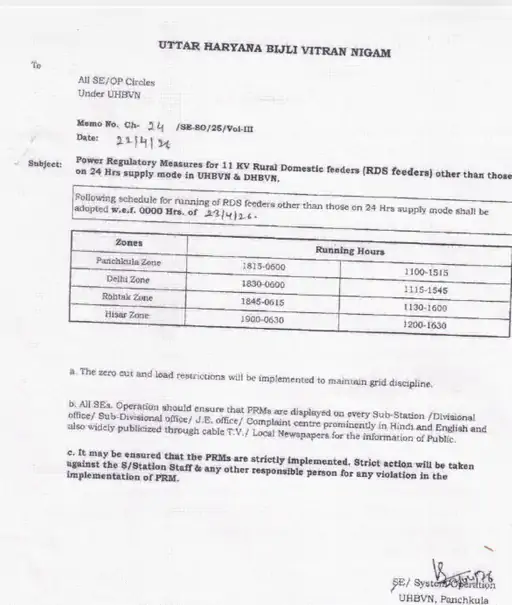 Haryana News: हरियाणा में बढ़ती गर्मी और उमस के बीच ग्रामीण इलाकों के लिए राहत भरी खबर सामने आई है। राज्य के उत्तरी हरियाणा बिजली वितरण निगम (UHBVN) ने ग्रामीण घरेलू फीडरों (RDS) के लिए नया बिजली आपूर्ति शेड्यूल जारी किया है, जो 23 अप्रैल की आधी रात से पूरे प्रदेश में लागू हो गया है।