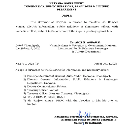 Haryana News: हरियाणा के रोहतक में डिस्ट्रिक्ट इंफॉर्मेशन एंड पब्लिक रिलेशन ऑफिसर (DIPRO) संजीव सैनी के निलंबन को विभाग ने वापस ले लिया है। हरियाणा सूचना एवं जनसंपर्क विभाग के अतिरिक्त मुख्य सचिव (ACS) अमित अग्रवाल की ओर से जारी आदेश में उनकी बहाली की पुष्टि की गई है।