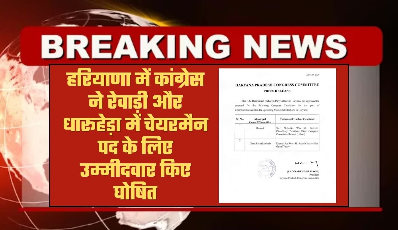 Haryana: हरियाणा में कांग्रेस ने रेवाड़ी और धारूहेड़ा में चेयरमैन पद के लिए उम्मीदवार किए घोषित, देखें लिस्ट